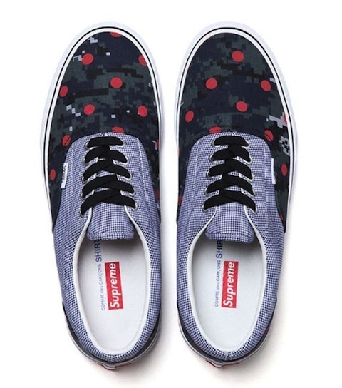 So the latest Supreme Comme des Garcons mashup is dropping at a Supreme store near you this Thursday June 27th. Supreme and Comme des Garcons apply their respective design touches to the Half Cab and the Era. NY, LA and London will have ’em on the 27th with the drop in Japan not until Saturday the 29th. Dover Street Market London and DSM online will drop them on June 27th and Dover Street Market Ginza June 29th.