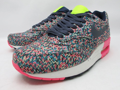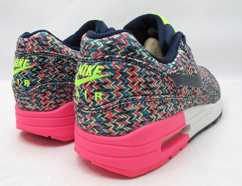 Nike keep the AM1s coming check these two makeups in what looks like ripstop material – one women’s pair in Tropical style with the zig zag pattern in pink, teal, black with some neon green in there. The men’s pair have the same zig zag pattern with a black and neon green colour scheme. I like the midsole split that’s a nice touch on these. Flat plastic swoosh, jury’s out on that at the moment.