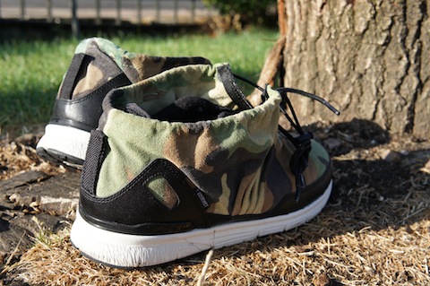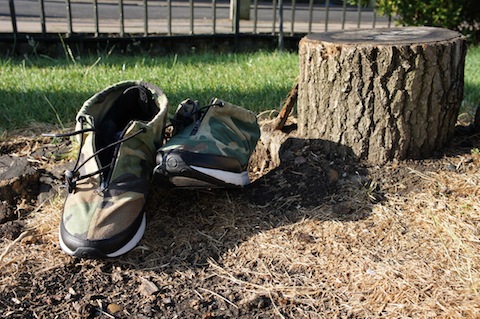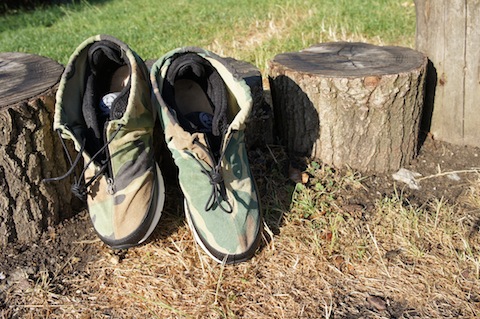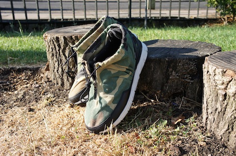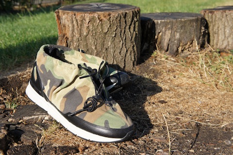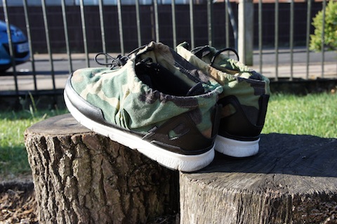 Ok so I’m a big fan of Gourmet footwear and when they dropped the Dignan I was like wow what a killer concept – it’s like one of those surgery type shoes with a sneaker underneath and add to that the zip and the drawstring to finish em off. Named after Mark Wahlberg’s character in The Departed who wore a pair of those surgery type waterproofers at the end of the movie, love the story behind them too. I copped both colourways of the polka dot ones when they dropped and was able to cop these killer camo samples, well a good friend did at a sample sale in London, thank you very much.