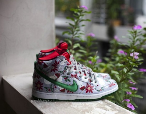 So every year there are these Christmas colourways. Lebron and others always drop a green and red pair and already we’ve seen Asics drop their Yule Lyte pack. But here come Concepts to drop a proper Christmas colourway on the SB Dunk High. No messing around here no not just a bit of green and red but proper Christmas wrapping paper Christmas jumper type ish. We just love these – a proper Christmas shoe. The release will see the 2 above and one other colour.