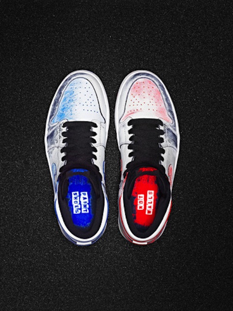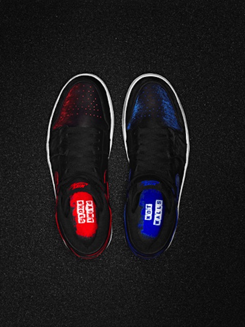 The two Lance Mountain Nike SB x AJIs recreate this aesthetic by mismatching both a black/red and black/royal colorway in one pair and then covering the colors, DIY-style, with black or white paint. As each pair is worn and the paint wears away to reveal the colors underneath, they will become unique to their wearer.