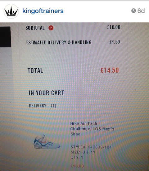 Anyway for those of you who don’t know my Instagram page is for the people the Kingdom shall I say… I post up all the latest stuff, all the latest release news and sometimes when the brands mess up and you can get a deal I am on it differently… So last Sunday I think that’s when it was…. I get hit on my phone by one of my Knights of the Round Table who looks out for these deals for me so I can share it, and the Knight told me the Nike Air Clay Blue Tech Challenge aka The Agassi’s were just £10?? on Nike.com (UK)……… Huh??? I was like WTF to get any Nike shoe for a Tenner is a gift from God but those???… So as the King does I went to investigate and to my surprise they were £10 and £14.99 with Shipping, AMAZING!!!. So I took a screen shot and shared it with the world as I do and the internet literally went NUTS, to be fair there were only Sizes 10 above by the time I hit the web but they sold out in like 2 mins after my post literally. And for the next few days I was thinking that Nike would not honor the price? Sigh? …. BUT to my surprise one of my loyal followers @OllieBoom Instagrammed a picture of his pair in hand, saying thank you to the King. ( I appreciated that mate a lot of the Kingdom don’t say anything)