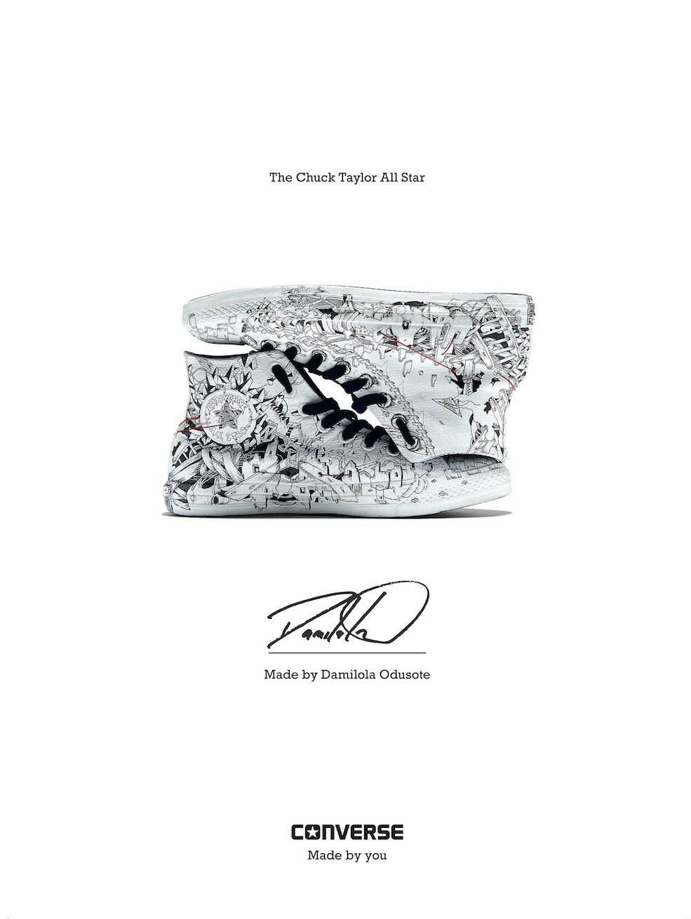 Supported by students from Central Saint Martins, Damilola will construct the unique and striking installation by hand within a gallery space on London’s Shoreditch high street. From the slightest mark to the most original personalisation, the impressions on each pair of Chucks hints at their unique story, making each pair owned a one-off. The raw Sneaker Portraits gathered together in Damilola’s installation will reveal and celebrate the self-expression of some of the city’s most diverse characters to create an artwork that is authentically Made by You.